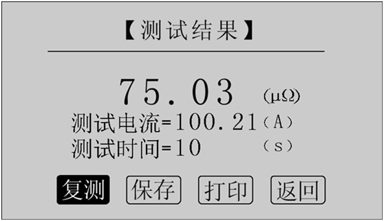 讀取測試結(jié)果,正在測試時,系統(tǒng)顯示“停止”,“返回”項(xiàng)。點(diǎn)擊“停止”,系統(tǒng)停止計時,電流停止輸出。點(diǎn)擊“返回”,系統(tǒng)停止計時,電流停止輸出并返回上一界面。注意:開始測試的前幾秒,由于電流沖擊和電容充電,測試結(jié)果不穩(wěn)定,5s后測試結(jié)果穩(wěn)定,用戶即可記錄數(shù)據(jù)。