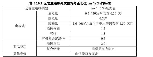 2.應在分閘狀態(tài)下測量每只套管的 tanδ 。當測得值超過標準時,應卸下油箱后進行分解試驗,此時測得的套管的 tanδ (%)值,應符合本標準表 16.0.3 的規(guī)定。