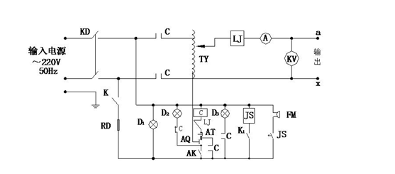 其中JS:時(shí)間繼電器 TY:自藕調(diào)壓器 FM:報(bào)警器 LJ:過(guò)流繼電器 D1、D2、D3:指示燈 C:交流接觸器 RD:熔斷器 K:總電源開(kāi)關(guān) K1:時(shí)間繼電器電源開(kāi)關(guān) AK:調(diào)壓器回零限位開(kāi)關(guān) AQ:起動(dòng)按鈕 CL:高壓硅堆 AT:停止按鈕 A:輸出電流表 KV:輸出電壓表