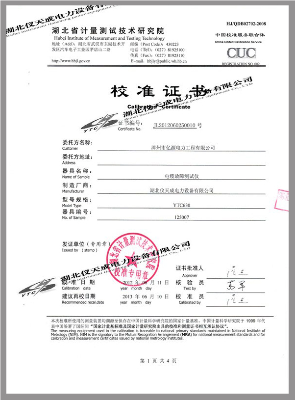 YTC630電纜故障測(cè)試儀鑒定證書(shū)